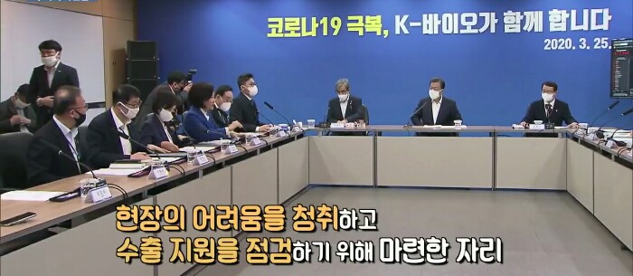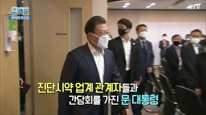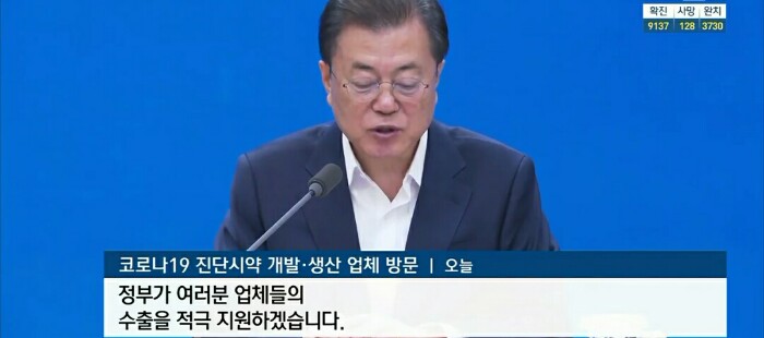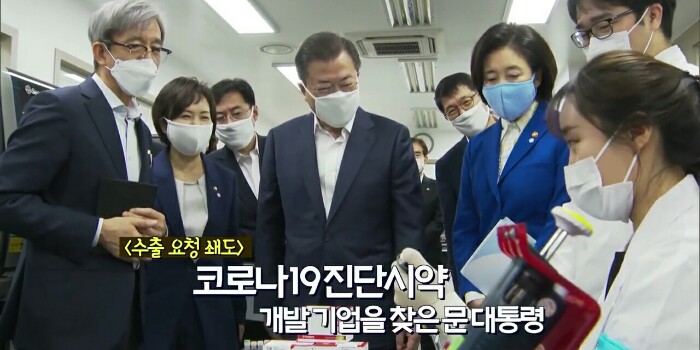 이 자리에서 문재인 대통령은 한국바이오 기업의 발빠른 진단시약 개발이 코로나19 극복의 발판이 됐고 정부, 민간기업, 의료진 등이 함께 힘을 모아 진단시약 개발에 동참한 신속한 대처에 감사를 전했습니다.