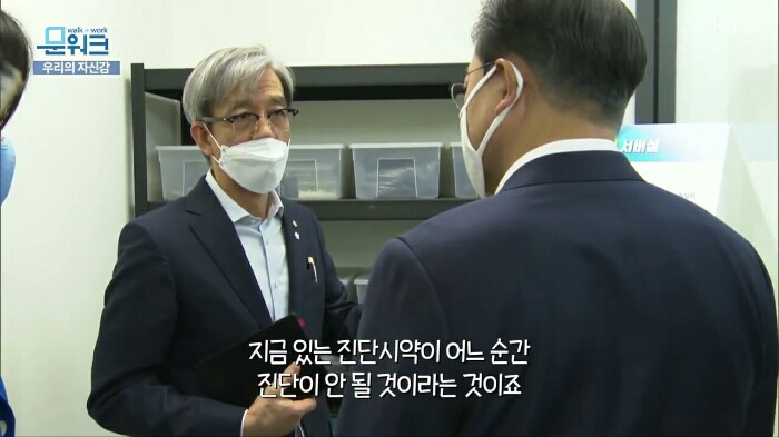 문재인 대통령은 연구시설을 둘러보며 기업의 진단키트 시약 생산, 개발, 공정에 대한 설명을 들었습니다. 문재인 대통령은 원래 하루 정도 걸리던 검사시간을 6시간으로 단축했고 지금은 더 단축됐다고 알려졌다며 지금은 어디까지 단축됐다고 말할 수 있는지 물었습니다.