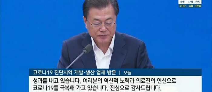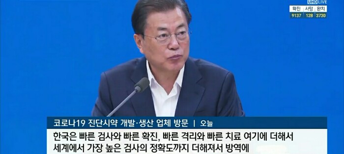 한국은 빠른 검사와 빠른 확진, 빠른 격리와 빠른 치료로 거기에 더해서 세계에서 가장 높은 검사의 정확도까지 더해져서 방역에 성과를 내고 있습니다. 여러분의 혁신적 노력과 의료진의 헌신으로 코로나19를 극복해가고 있습니다. 진심으로 감사드립니다.