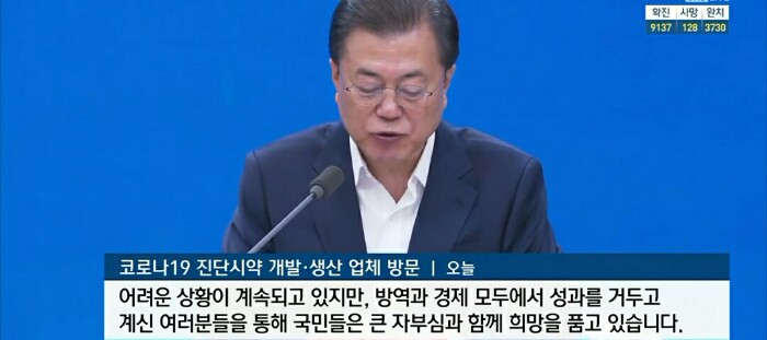 우리 진단시약 생산업체들의 활약이 얼마나 크고 자랑스러운지 오늘 국민들께 보여드리고 또 국제사회에도 희망을 드리기 위해 코로나19 진단시약 개발업체 씨젠을 찾았습니다.