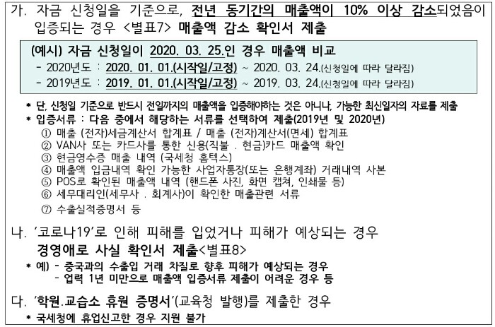 ➁ 코로나 19 관련 다음 하나에 해당하는 경우 - 자금 신청일을 기준으로, 전년 동기간의 매출액이 10% 이상 감소되었음이 입증되는 경우 - 코로나로 인해 피해를 입었거나 피해가 예상되는 경우 - 학원, 교습소 휴원 증명서를 제출한 경우