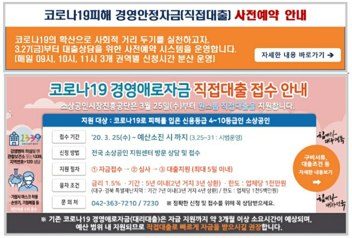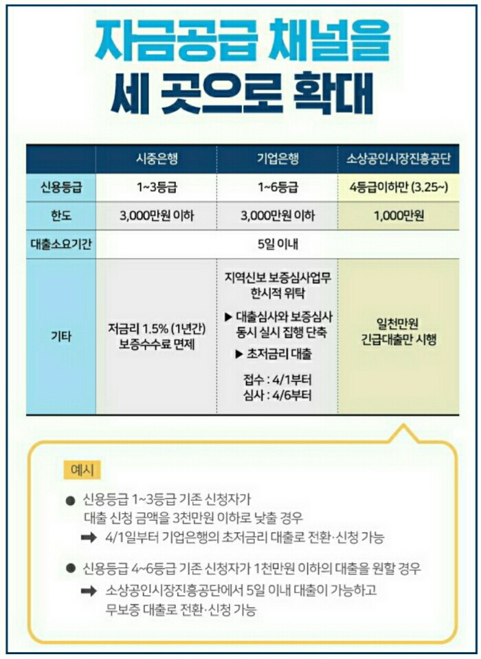 1. 대출금리 : 연 1.5% (고정금리) 2. 지원방식 : 보증서 없이 직접대출 3. 대출한도 : 업체당 최고 1000만원 이내, 특별재난지역 업체는 1500만원 이내