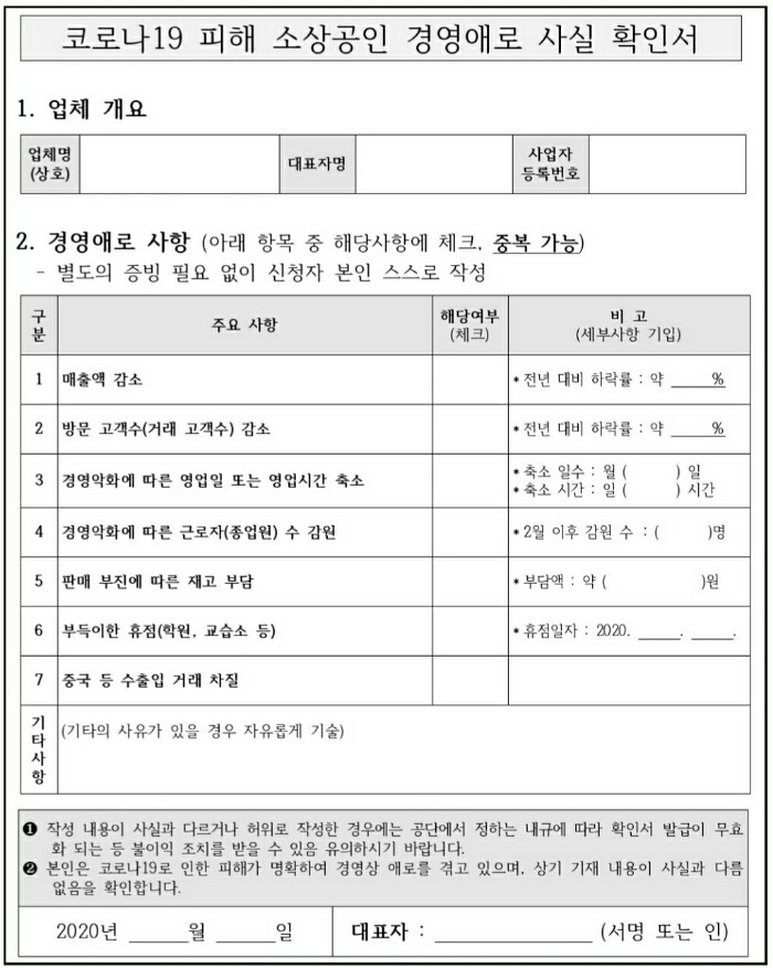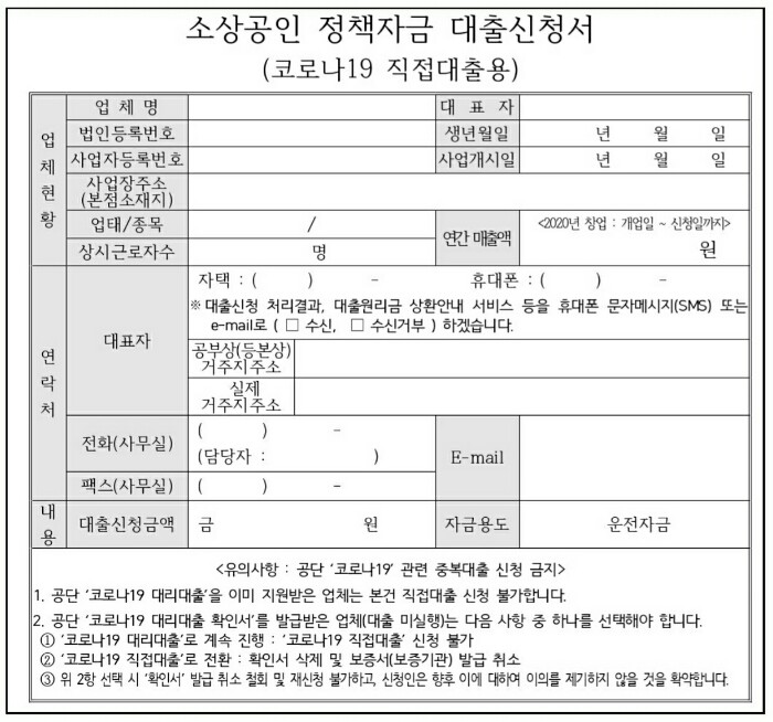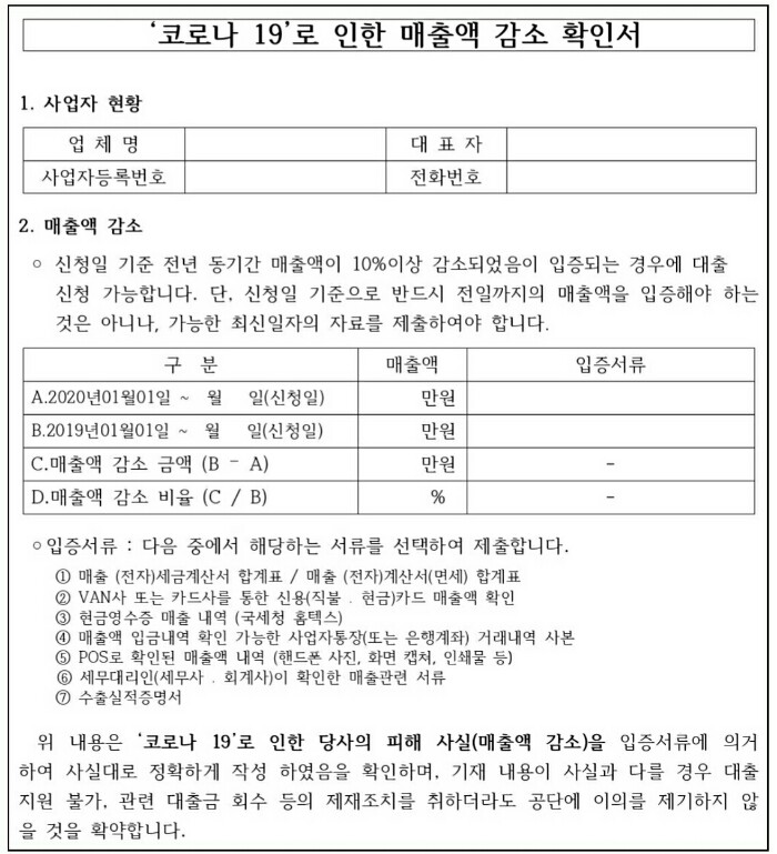 소상공인 정책자금 직접 대출 신청서코로나 19로 인한 매출액 감소 확인서코로나19 피해 소상공인 경영애로 사실 확인서