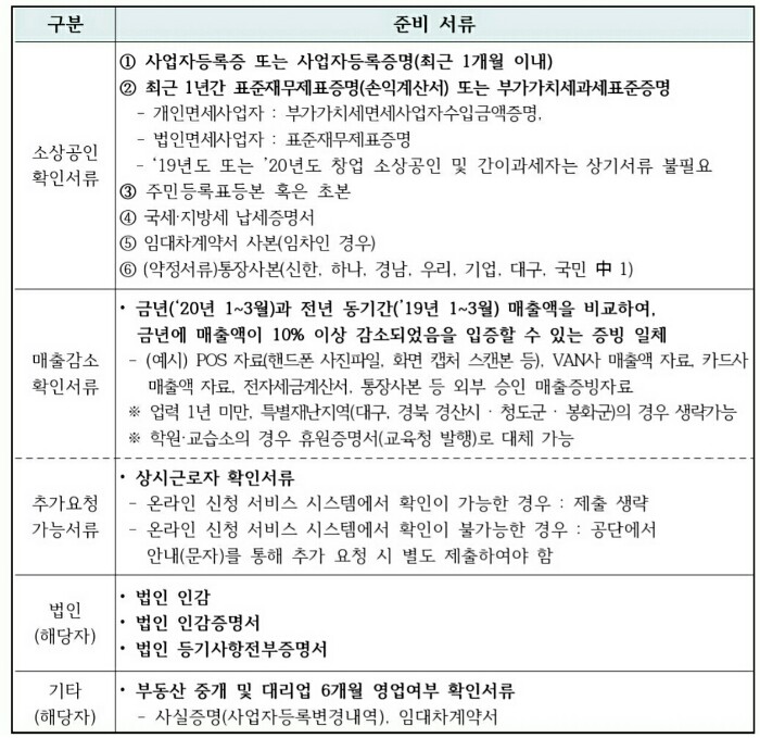 ② 최근 1년간 표준재무제표증명 (손익계산서) 또는 부가가치세과세표준증명 - 개인면세사업자 : 부가가치세면세사업자수입금액증명 - 법인면세사업자 : 표준재무제표증명 - 2019년도 또는 2020년도 창업 소상공인 및 간이과세자는 상기서류 불필요 ③ 주민등록표등본 혹은 초본 ④ 국세 지방세 납세증명서 ⑤ 임대차계약서 사본(임차인 경우) ⑥ 통장사본 : 신한은행, 하나은행, 경남은행, 기업은행, 대구은행, 국민은행, 우리은행 중 택 1
