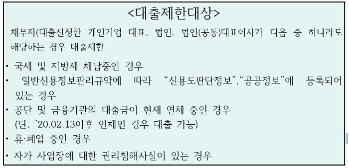 ➂ 사업자등록증을 소지한 개인 또는 법인 사업자로 사업자등록증(명) 상 개업일이 2020년 2월 13일 전일 것 ➃ 정책자금 지원제외 업종이 아닐 것 ➄ 대출제한 사유에 해당하지 아니할 것