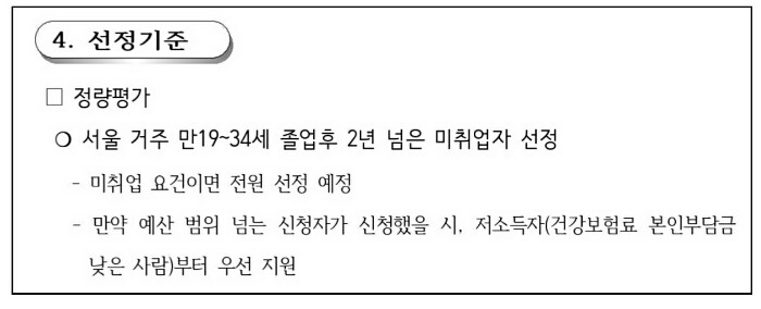 4. 서울청년수당 선정기준은 정량평가를 기준으로 한다. - 서울 거주 만 19~34세 졸업후 2년 넘은 미취업을 선정한다. - 미취업 요건이면 전원 선정한다. - 만약 예산 범위에 넘는 신청자가 신청했을 시 저소득자 건강보험료 본인부담금 낮은 사람부터 우선 지원한다.