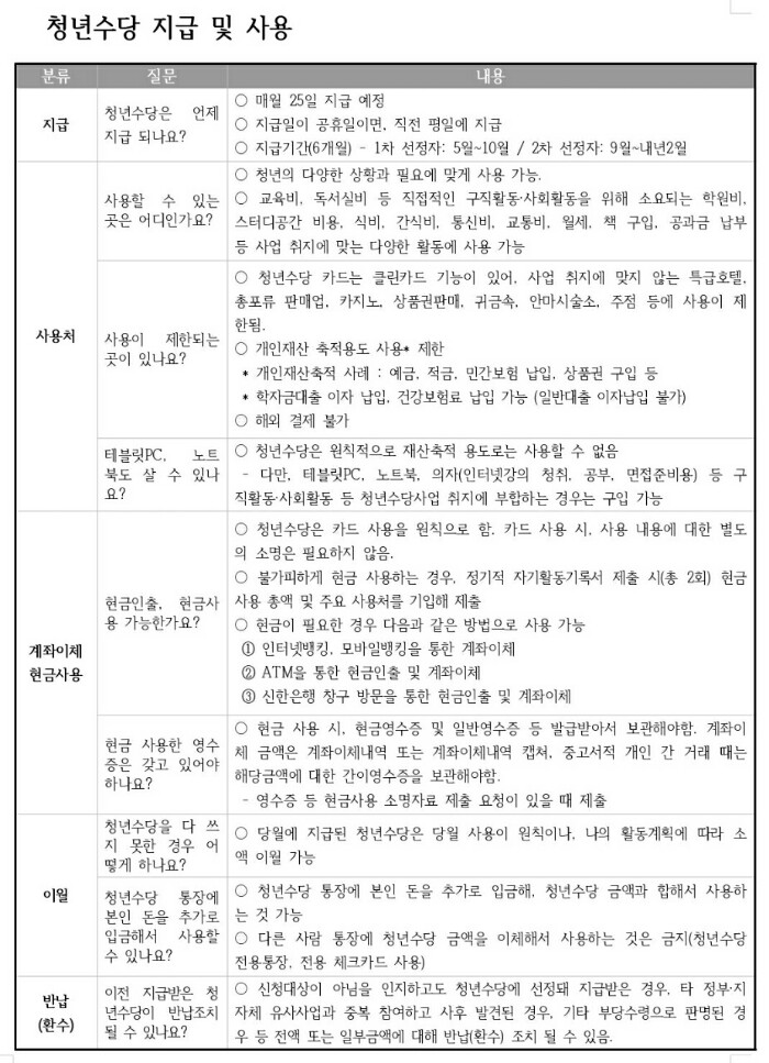 청년수당은 언제 지급 되나요? - 매월 25일 지급 예정 - 지급일이 공휴일이면, 직전 평일에 지급 - 지급기간 6개월 - 1차 선정자 : 5월~10월 / 2차 선정자: 9월~내년 2월 사용처