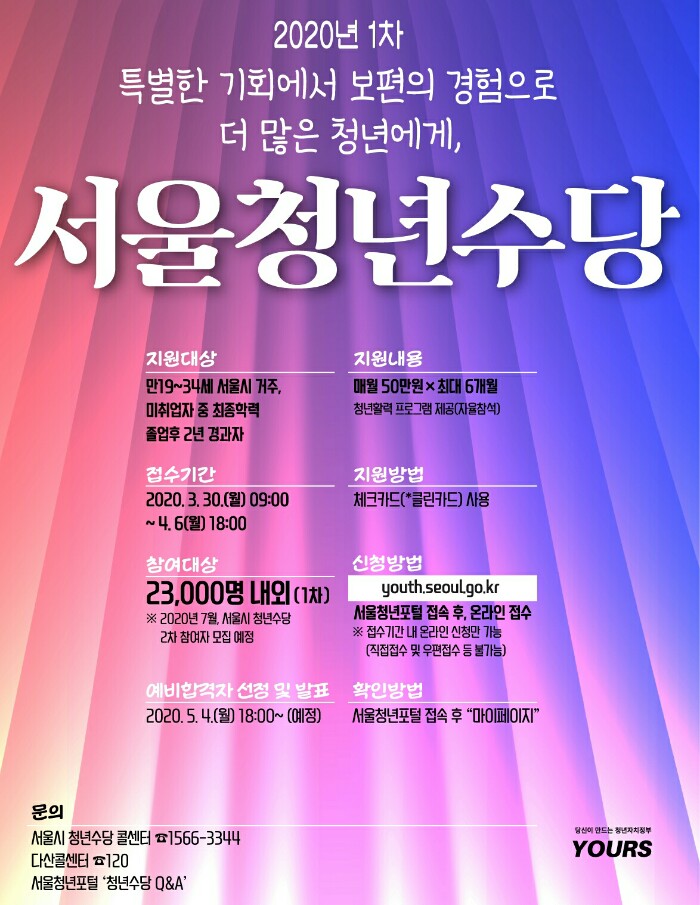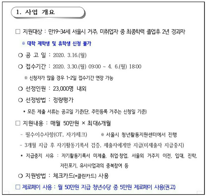 지원대상 : 만19~34세 서울시 거주 - 미취업자 중 최종학력 졸업후 2년 경과 - 재학생, 휴학생 신청 불가 접수기간 : 2020년 3월30일 09:00 ~ 4월6일 18:00 선정인원 : 23,000명 내외(예정) 선정방법 : 정량평가 지원금액 : 매월 50만원 × 최대 6개월 지급방법 : 체크카드 (클린카드) 사용 제로페이 사용 : 월 50만원 지급, 청년수당 중 5만원 제로페이 사용을 권고한다.