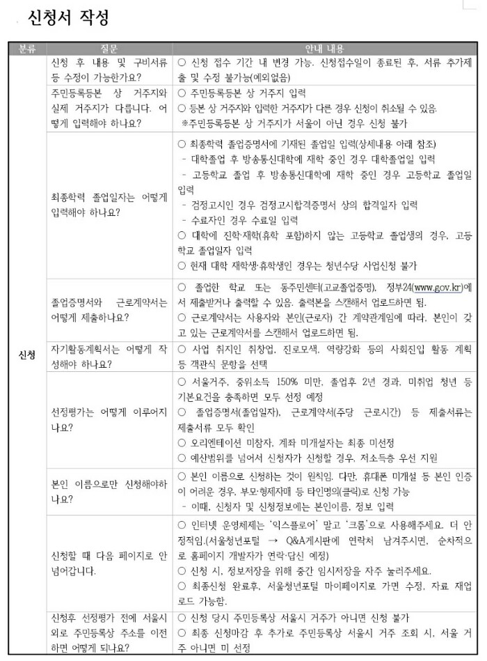 신청방법 : 서울청년포털 (youth.seoul.go.kr) 접속 후 온라인으로 접수한다. 접수기간 내 온라인 신청만 가능하고 직접 접수 및 우편접수는 불가능한다.
