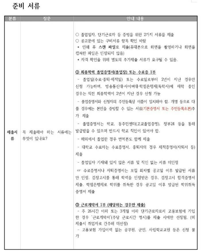 준비서류 2종 : 모든 발급서류는 스캔해서 업로드한다. 화면 캡처는 인정하지 않는다. ① 고교, 대학, 대학원 졸업증명서 또는 수료증 1부 ② 근로계약서 (선택사항) : 고용보험 가입 단기취업자만 제출하고 고용보험 미가입 단기취업자는 제출할 필요가 없다.