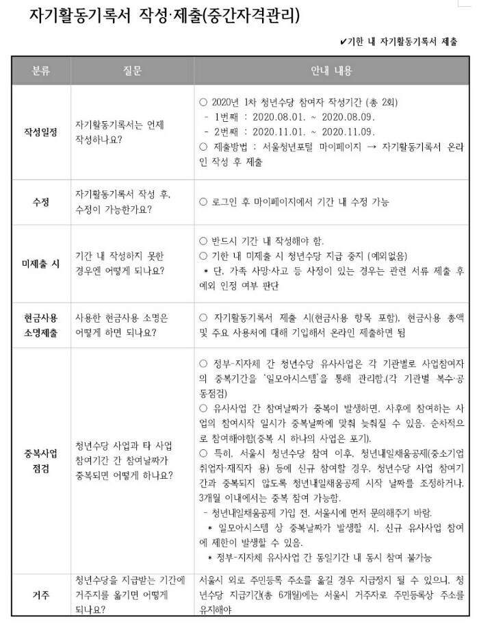 제출방법 : 서울청년포털 마이페이지 → 자기활동기록서 온라인 작성 후 제출