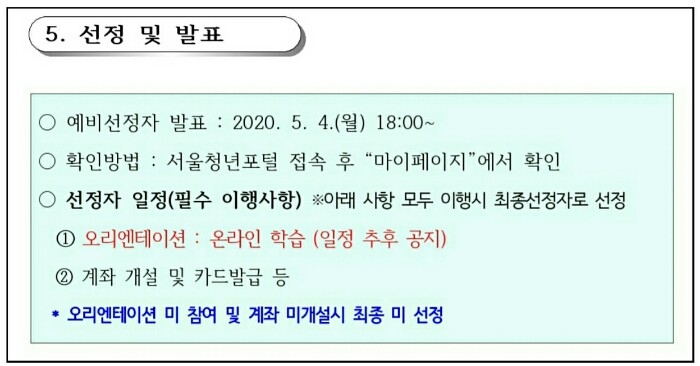 예비선정자 발표 : 2020년 5월4일 18:00~ 확인방법 : 서울청년포털 접속 후 '마이페이지'에서 확인 선정자 필수이행사항 : ① 오리엔테이션 참석 : 온라인참여 (2020년 5월6일~13일) ② 계좌개설 및 카드발급 ③ 약정체결 ④ 마음건강 자가체크 진행