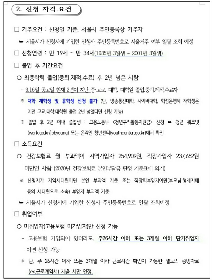 거주요건 : 신청일 기준 서울시 주민등록상 거주자 신청연령 : 만 19세 ~ 만 34세 - 1985년 3월생 ~ 2001년 3월생 졸업 후 기간요건 - 최종학력 졸업 (중퇴, 제적, 수료) 후 2년 넘은 사람 - 졸업후 2년 경과 : 2018년 3월 이전 졸업자만 해당한다. - 3월16일 기준 2년이 지난 중고교, 대학, 대학원 졸업 중퇴 제적 수료자 - 방송통신대학교, 사이버대학, 학점은행제에 재학 중인 경우는 이전 고교, 대학, 대학원 졸업이 2년이 지난 경우 신청이 가능하다. 대학생으로 간주 안한다.