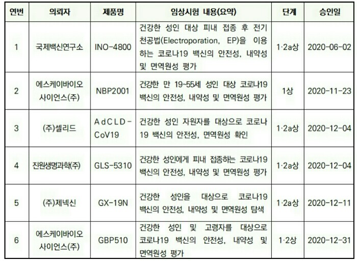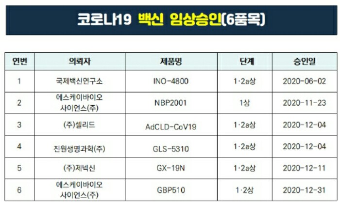 ▶ 국산 코로나 백신 임상승인 단계 (6품목)