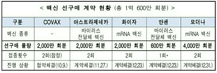 정부는 2020년 12월 31일 기준 코로나 백신 총 1억 600만 회분 구매계약을 체결 했습니다.