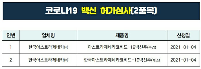 1) 아스트라제네카 백신은 허가심사 단계 중입니다.