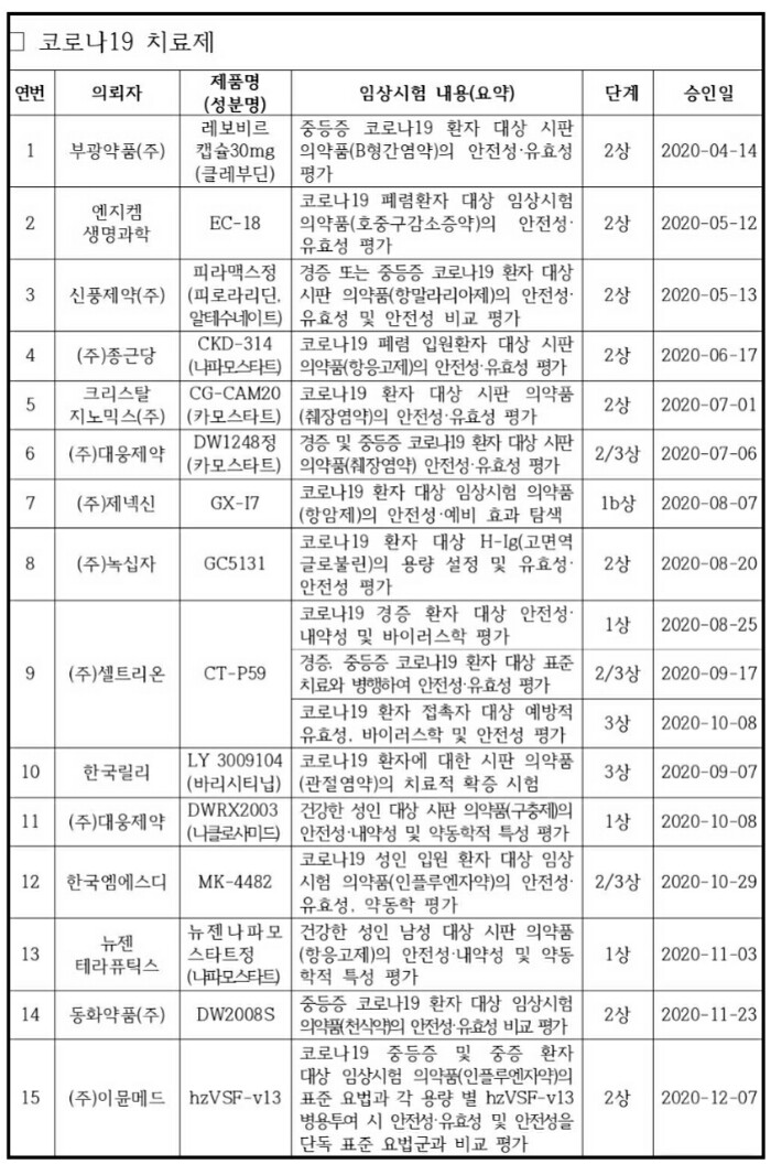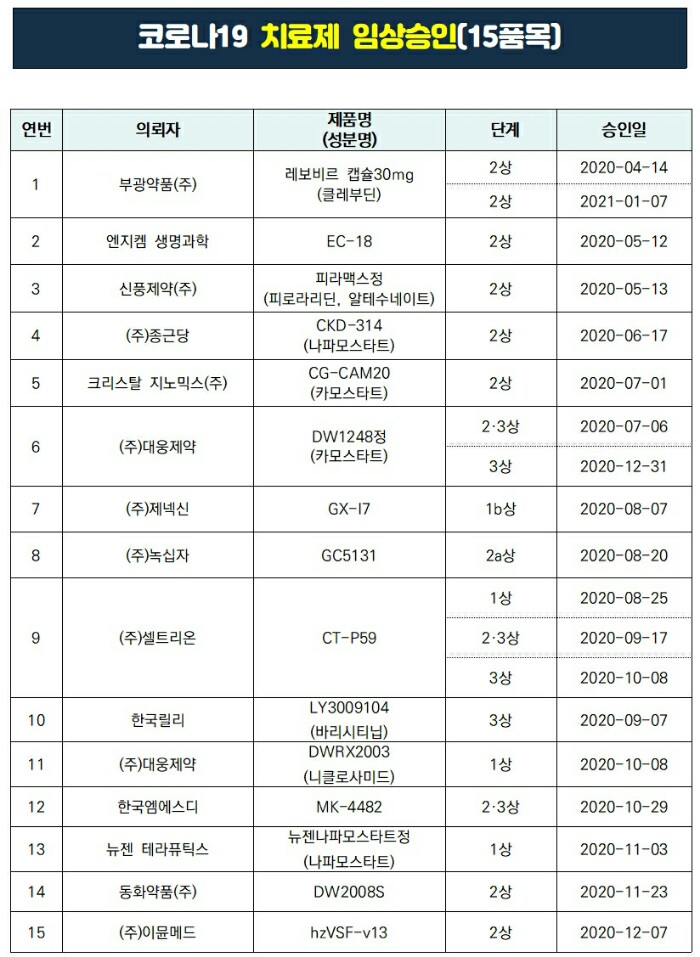 ▶ 코로나19 치료제 임상승인 단계 (15품목)