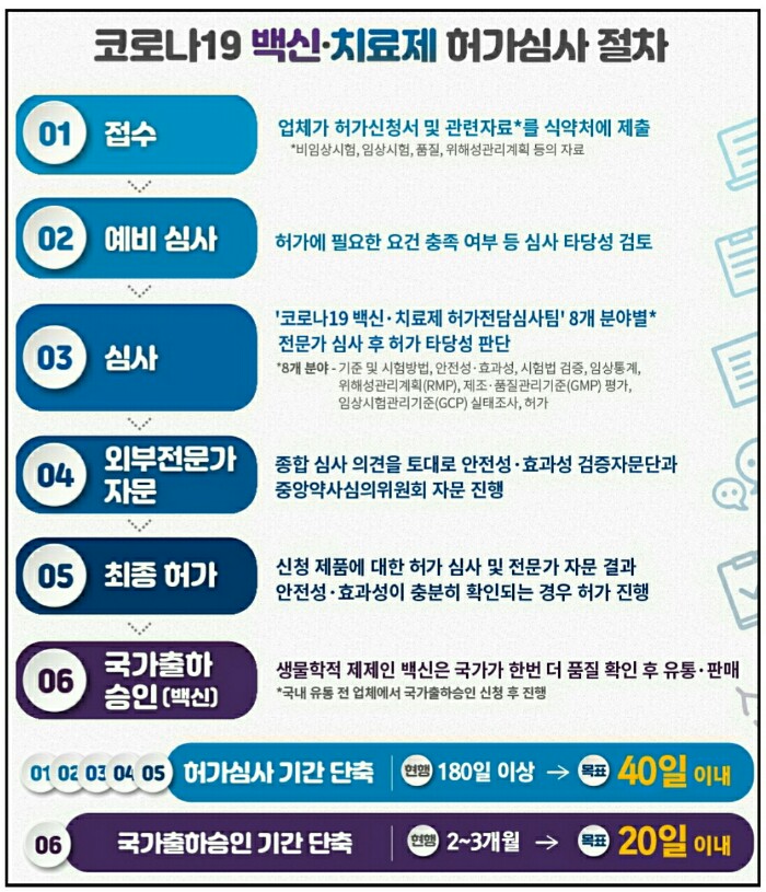 식약처는 앞으로도 개발되는 코로나19 치료제 및 백신의 허가신청이 있을 경우 안전성과 효과성을 철저히 검증하는 한편 최대한 신속히 허가할 계획입니다.