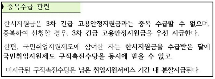한시지원금은 3차 긴급 고용안정지원금과는 중복 수급할 수 없으며 중복하여 신청할 경우 3차 긴급 고용안정지원금을 우선 지급합니다.