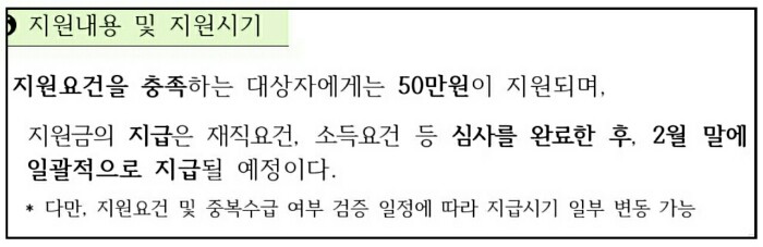 지원내용 및 지원시기 : 50만원을 2월말 지급합니다.