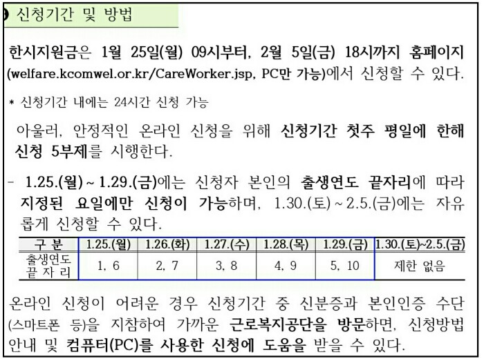 한시지원금은 1월 25일(월) 09시~2월 5일(금) 18시까지 신청 홈페이지에서 PC만 신청할 수 있습니다.