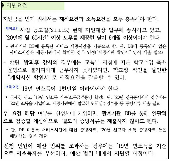 - 한편, 방과후 강사의 경우에는 교육부 지침에 따른 학교수업 축소 운영으로 불가피하게 근무하지 못하였다면 학교장 직인을 날인한 "계약사실 확인서"로 재직요건을 갈음할 수 있습니다.