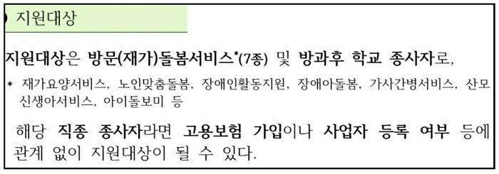 지원대상자는 방문(재가)돌봄서비스 7종 및 방과후 학교 종사자 입니다.
