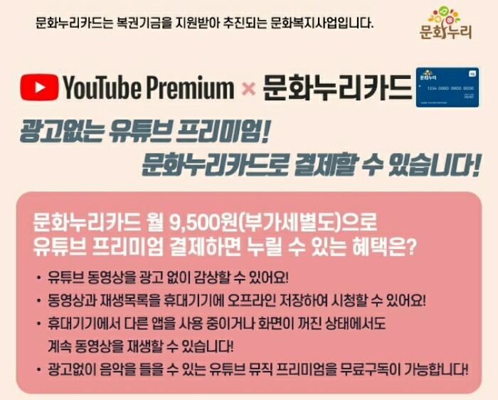 예) 문화누리카드로 카카오페이지 캐시, 유튜브 프리미엄을 결제할 수 있습니다.