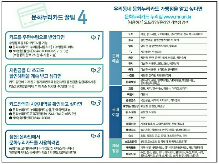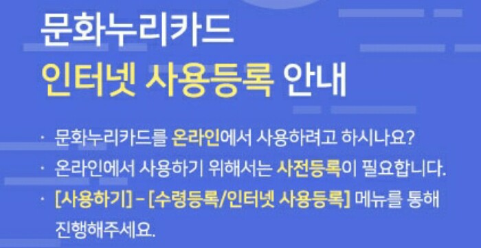문화누리카드 사용처는 반드시 등록된 오프라인, 온라인 가맹점에서만 결제가 가능합니다.