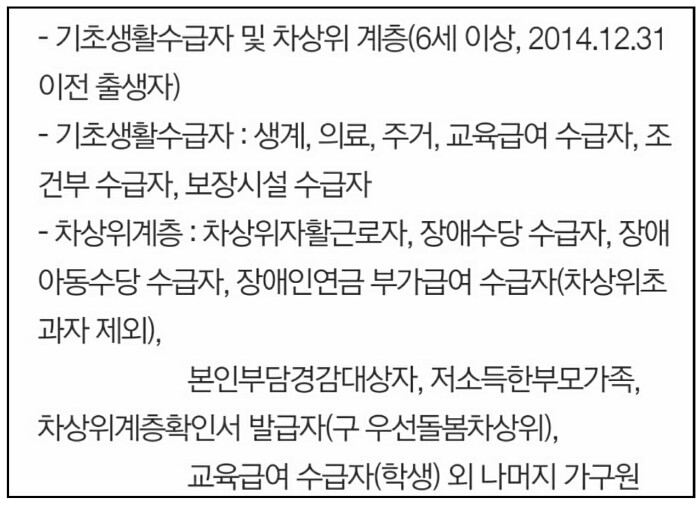 - 차상위계층 : 차상위자활근로자, 장애수당 수급자, 장애아동수당 수급자, 장애인연금 부가급여 수급자(차상위초과자 제외), 본인부담경감대상자, 저소득한부모가족, 차상위계층확인서 발급자(구 우선돌봄차상위), 교육급여 수급자(학생) 외 나머지 가구원