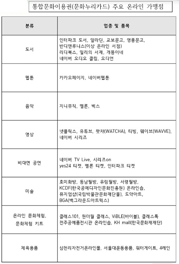 문화누리카드 (통합문화이용권) 온라인 가맹점 사용처