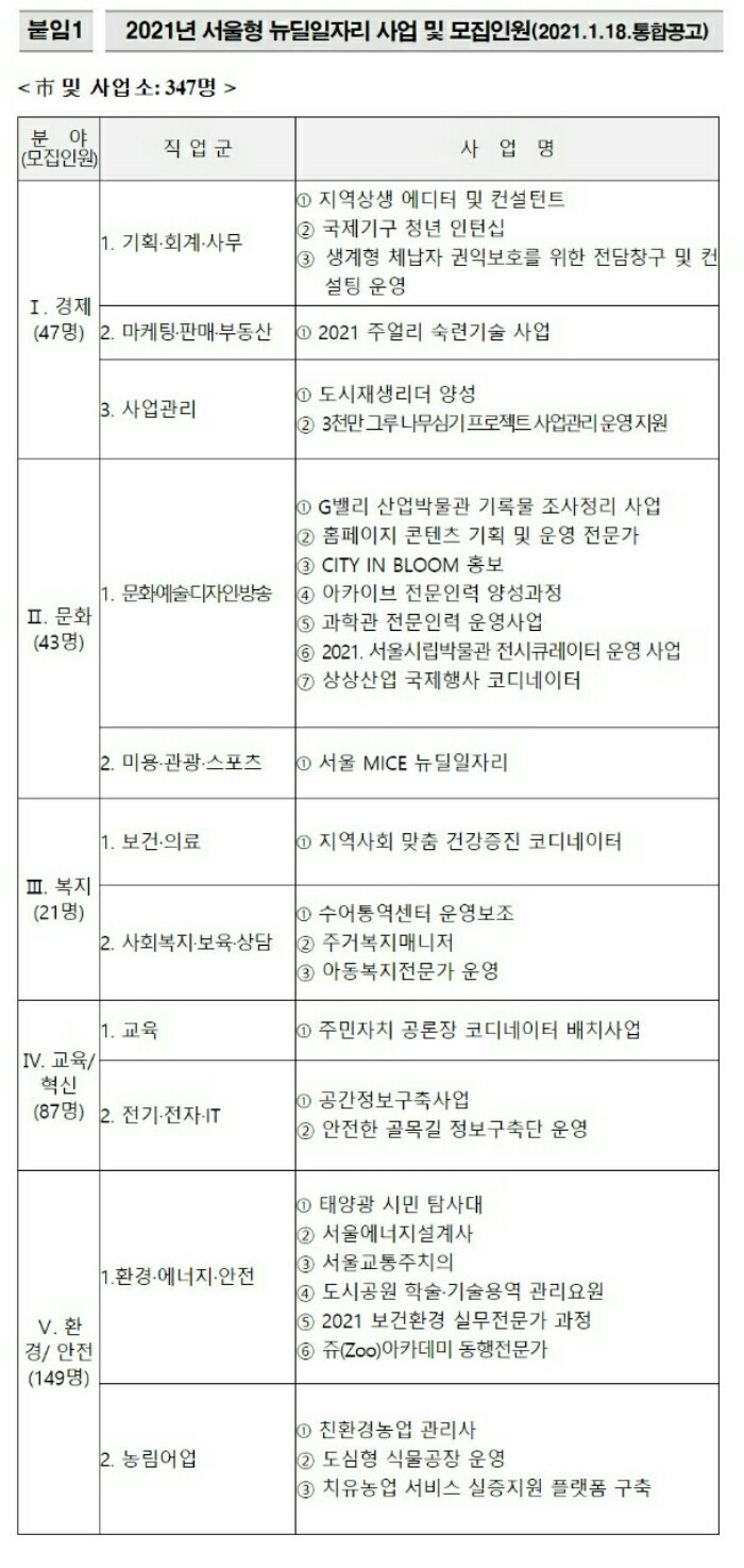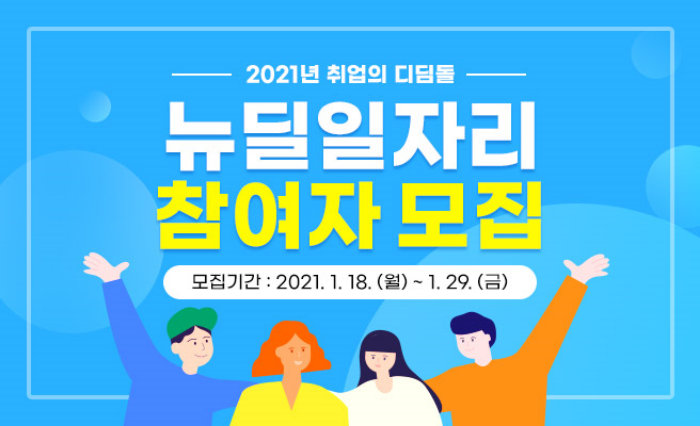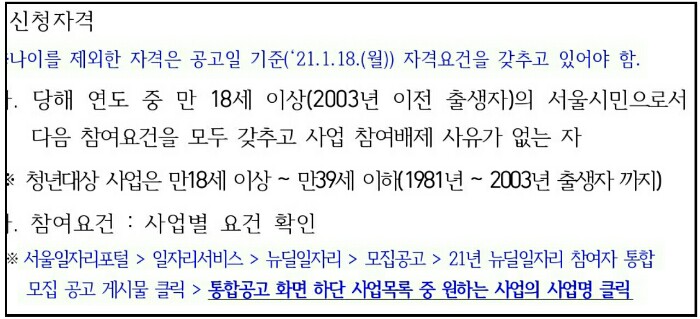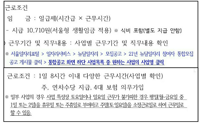 - 서울일자리포털 → 일자리서비스 → 뉴딜일자리 → 모집공고 → 2021년 뉴딜일자리 참여자 통합모집 공고