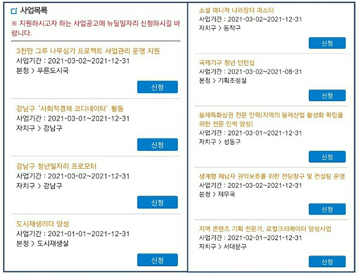 - 서울일자리포털 → 일자리서비스 → 뉴딜일자리 → 모집공고 → 2021년 뉴딜일자리 참여자 통합모집 게시물 클릭 → 통합공고 화면 하단 사업목록 중 원하는 사업의 사업명 클릭