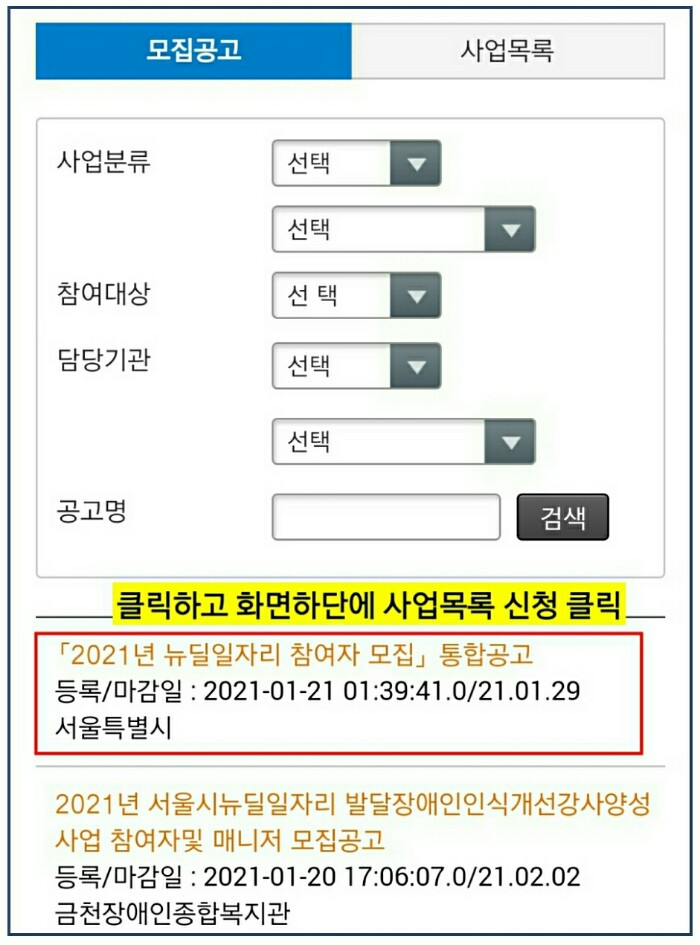 - 서울일자리포털 → 일자리서비스 → 뉴딜일자리 → 모집공고 → 2021년 뉴딜일자리 참여자 통합모집 공고 게시물 클릭 → 통합공고 화면 하단 사업목록 중 원하는 사업의 사업명 클릭