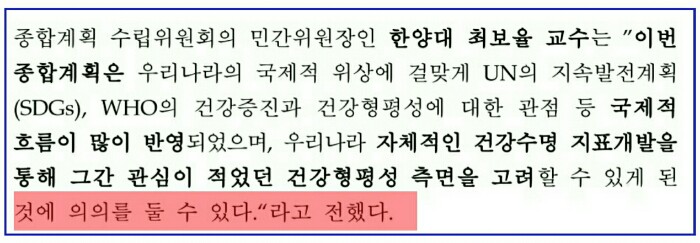 5차 종합계획 수립위원회의 민간위원장인 한양대 최보율 교수는 이번 종합계획은 우리나라의 국제적 위상에 걸맞게 UN의 지속발전계획, WHO의 건강증진과 건강형평성에 대한 관점 등 국제적 흐름이 많이 반영되었으며 우리나라 자체적인 건강수명 지표개발을 통해 그간 관심이 적었던 건강형평성 측면을 고려할 수 있게 된 것에 의의를 둘 수 있다라고 전했습니다.