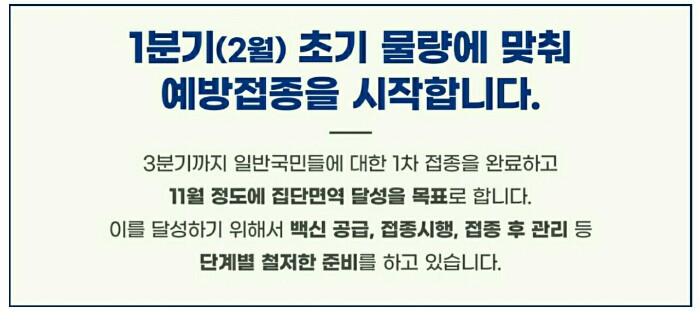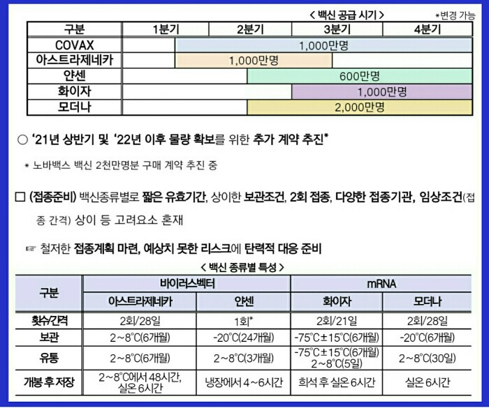 개별 제약사를 통해 계약한 백신은 아스트라제네카는 1분기부터, 얀센과 모더나는 2분기부터, 화이자는 3분기부터 단계적으로 도입할 예정이며 범부처 차원에서 모든 역량을 동원하여 도입 시기를 앞당기기 위해 노력하고 있습니다.