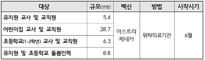 최근 유치원, 초등학교 1, 2학년이 등교함에 따라 학교와 돌봄 공간을 보호하기 위한 예방접종을 시작합니다. 우선 4월 중 특수교육과 장애아보육, 유치원 및 학교 내 보건교사와 어린이집의 간호인력에 대한 접종을 실시합니다. 이어서 6월에는 유치원과 어린이집, 초등학교 1‧2학년을 담당하는 교사, 교직원 및 관련 종사자에 대한 접종을 단계적으로 추진합니다.