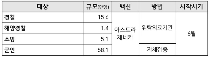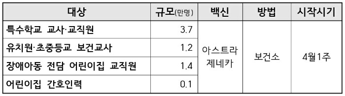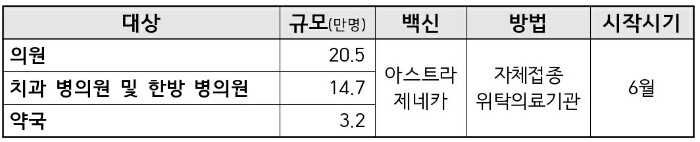 아울러, 접종 순서에 따라 고위험 의료기관의 보건의료인 35만4000명, 코로나19 방역 역학조사 검사, 검역 요원 등 약 7만8000명을 대상으로 3월부터 아스트라제네카 백신 예방접종을 시행합니다.