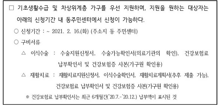 - 이식수술 : 수술지원신청서, 수술가능확인서(의료기관의 확인), 건강보험료 납부확인서 및 건강보험증 사본