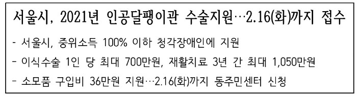 서울시는 청각장애인을 위한 인공달팽이관 이식수술 및 재활치료 비용을 지원합니다. 또한 인공달팽이관 소모품 구입비용도 1인당 매년~최대 3년까지 최대 36만원까지 지원합니다.