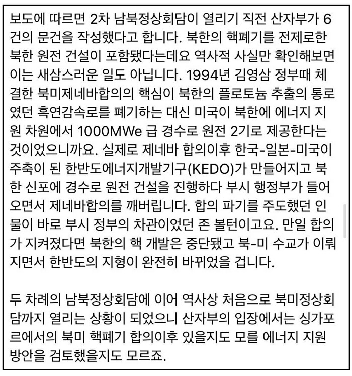1994년 김영삼 정부때 체결한 북미제네바합의의 핵심이 북한의 플로토늄 추출의 통로였던 흑연감속로를 폐기하는 대신 미국이 북한에 에너지 지원 차원에서 1000MWe 급 경수로 원전 2기로 제공한다는 것이었습니다.