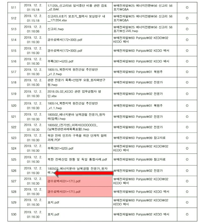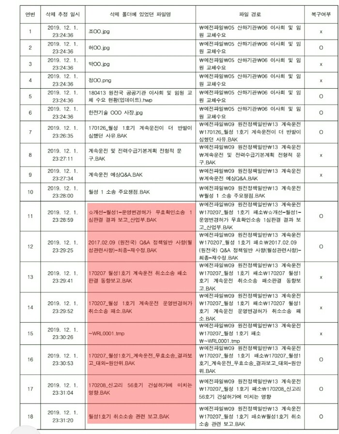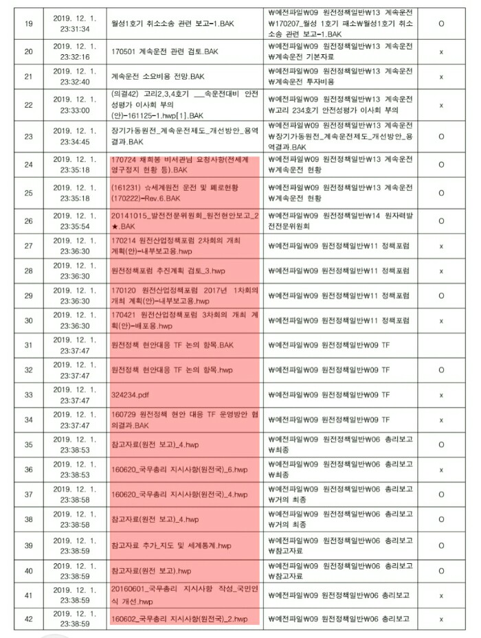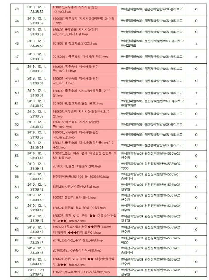 산업부 공무원이 삭제한 원전 관련 530개 문서에는 신규원전 추진 자료, 월성원전 1호기 수명연장 무효 소송에 패소한 박근혜 정부의 대책자료, 원전추진 논리자료, 산업부장관 출신 자유한국당 윤상직 국회의원 면담자료, 면담 후속조치결과 자료, 20대 총선 탈핵에너지전환 정책 대응 자료, 당시 황교안 국무총리 보고자료 등 온통 원전 추진 정책 자료라도 포함되어 있습니다.