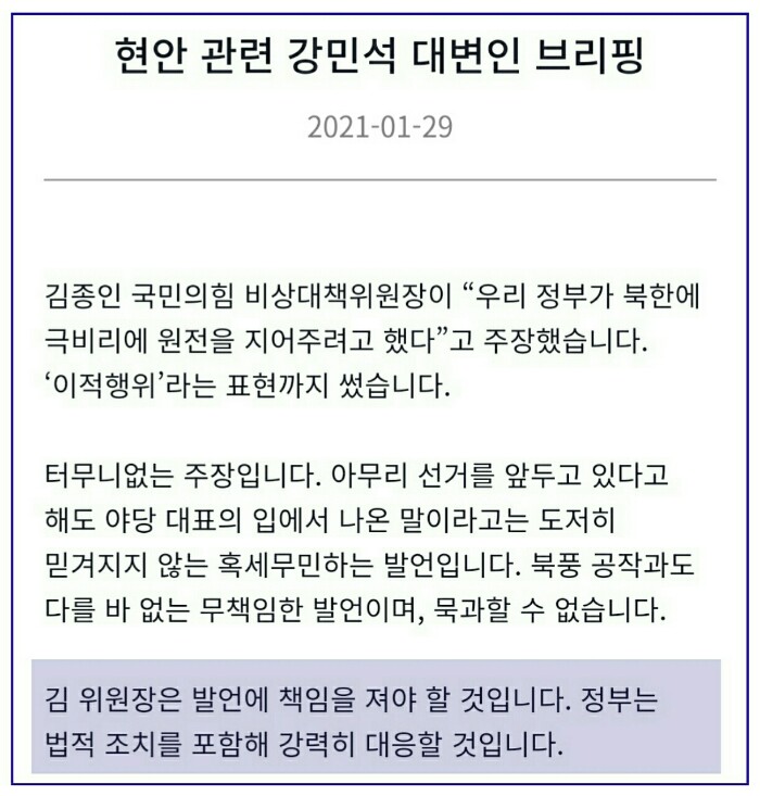 터무니없는 주장입니다. 아무리 선거를 앞두고 있다고 해도 야당 대표의 입에서 나온 말이라고는 도저히 믿겨지지 않는 혹세무민하는 발언입니다. 북풍 공작과도 다를 바 없는 무책임한 발언이며, 묵과할 수 없습니다.