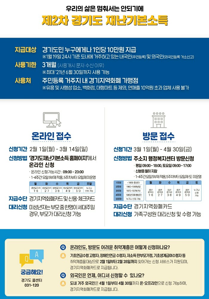 3월 1일부터 신분증을 지참하고 주소지 읍면동 행정복지센터를 방문하면 선불카드 형식의 경기지역화폐카드를 통해 재난기본소득 수령이 가능합니다.