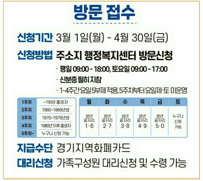 2. 방문 신청방법 : 3월 1일 ~ 4월 30일 주소지 읍면동 행정복지센터를 방문해서 신청할 수 있습니다.