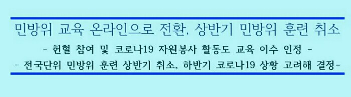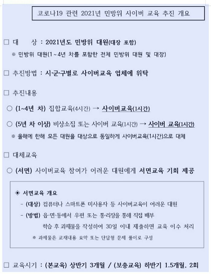 1. 2021년 코로나 감염병 확산 방지를 위해 민방위 교육과 훈련 계획을 변경합니다.