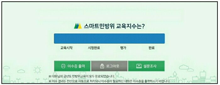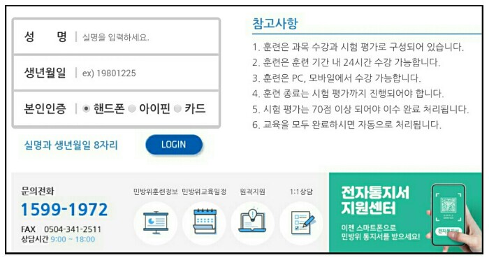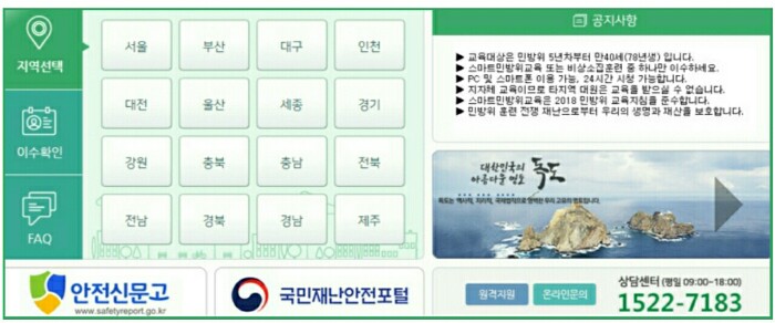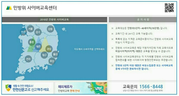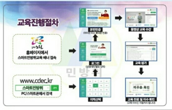 - 민방위 교육은 민방위 사이버교육(https://www.cmes.or.kr)과 스마트 민방위교육(https://www.cdec.kr)에서 받을 수 있습니다.