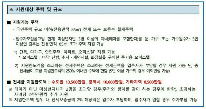 6. 전세보증금 지원 한도액 : 수도권 1억3500만원, 광역시 1억원, 기타지역 8500만원을 지원합니다.