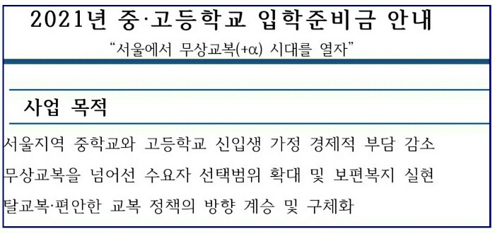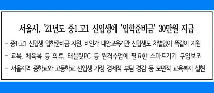 전국 최초로 서울시는 2021년도에 입학하는 중학교 1학년, 고등학교 1학년 신입생에게 입학준비금 30만원을 지급합니다.