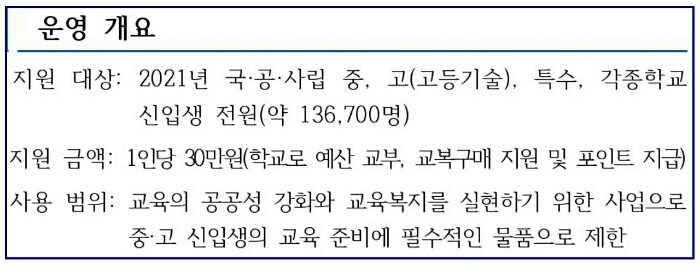 1. 지원 대상 : 2021년 국·공·사립 중학교, 고등학교, 특수, 각종학교 신입생 전원